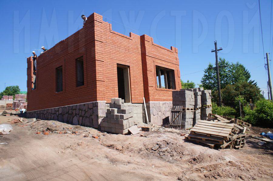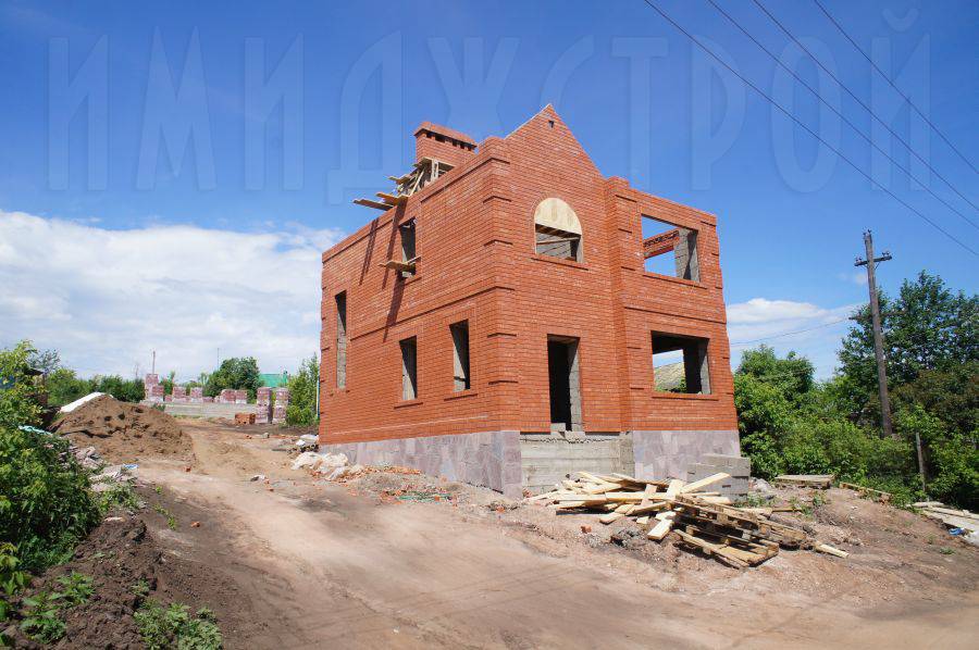 Фасад коттеджей отделывали облицовочным кирпичом традиционного красного цвета. Для экономии времени и большего удобства эти два процесса велись одновременно – укладка стен из керамзитобетонных блоков и их облицовка.