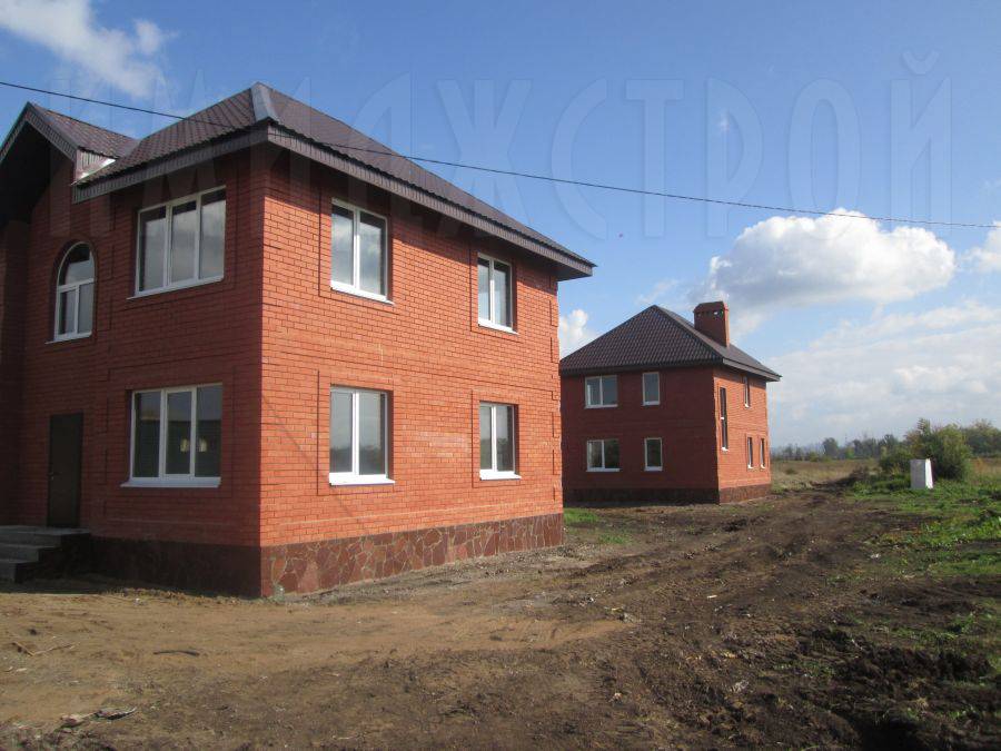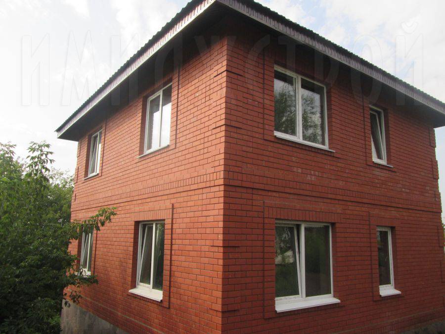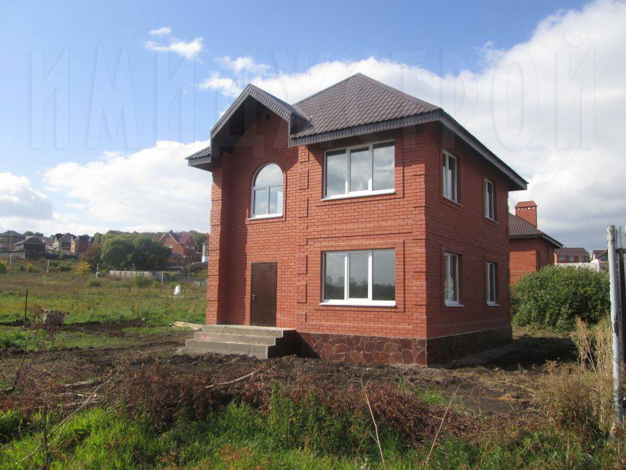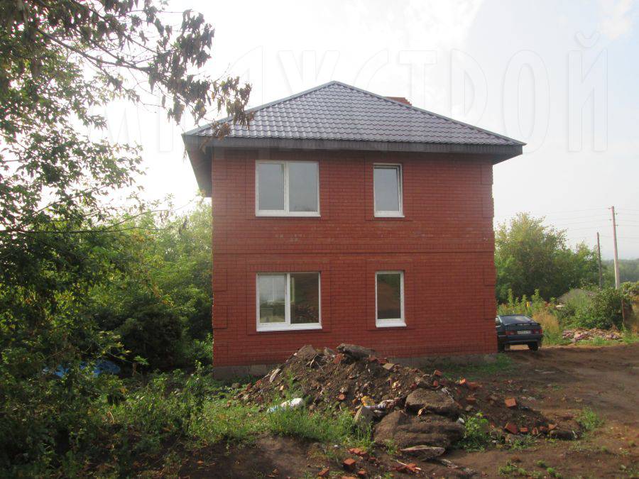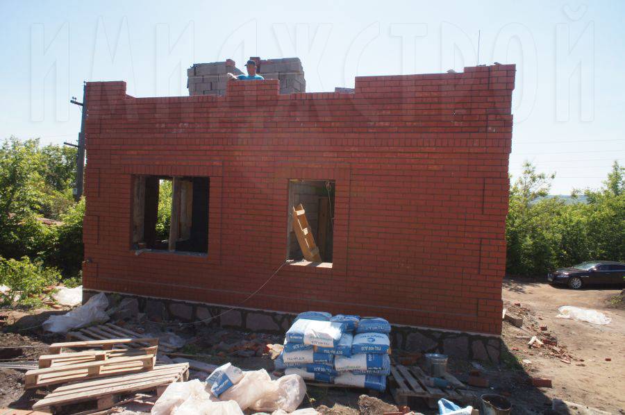 К сентябрю обе коробки были готовы, и кровельщики поочередно накрыли крыши шатрового типа металлочерепицей. Параллельно были вставлены металлопластиковые окна с белым профилем, которые красиво выделяются на фоне красных стен и коричневой крыши.